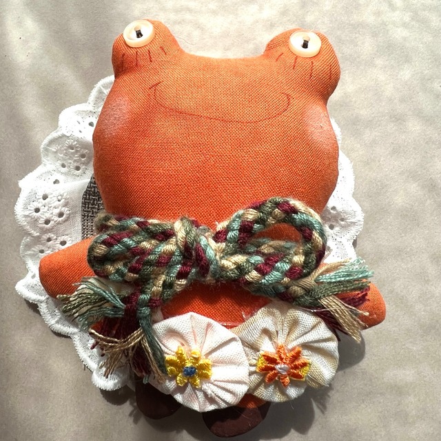 カラフルリボンがキュートなオレンジ色のカエルさんのマスコットが、あなたの胸元にぴったりの57mmサイズの缶バッジになりました! 可愛いらしいデザインで、あなたの日常にほんのちょっぴりの幸せをプラスしてくれるかもしれません。 バッグや帽子などのアイテムに付けたり、お部屋のインテリアとして飾るのも素敵ですよ。 ぜひ手に取って、あなただけのお気に入りを見つけてください! 【商品詳細】 商品名:マスコット缶バッジ57mm カラフルリボンのカエルさん(オレンジ) カテゴリ:雑貨・アクセサリー 素材(缶バッジ部分):ステンレス、スチール 【商品サイズ】 缶バッジ直径:57mm 全長:約100mm ※レース部分含む 厚さ:3cm~5cm 【購入時の注意点】 ひとつひとつ心を込めて丁寧に手作りしていますが、ハンドメイド作品のため既製品のような完璧なお品ではございません。 すぐに壊れる事がないように制作しておりますが、優しく扱っていただけると幸いです。 ご理解いただいた上でご購入をお願い致します。