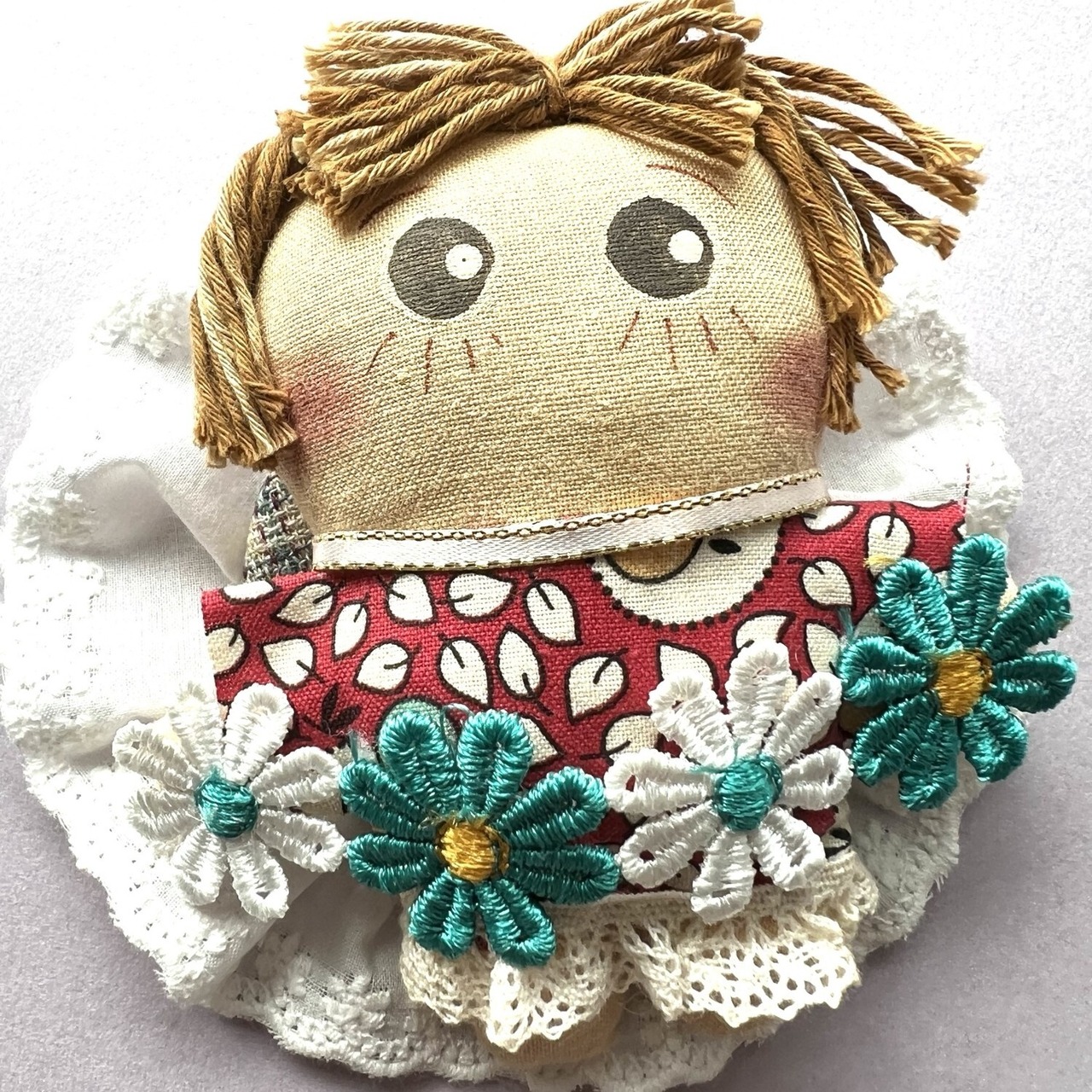 赤色服が良く似合うキュートな女の子の人形が、あなたの胸元にぴったりの57mmサイズの缶バッジになりました!