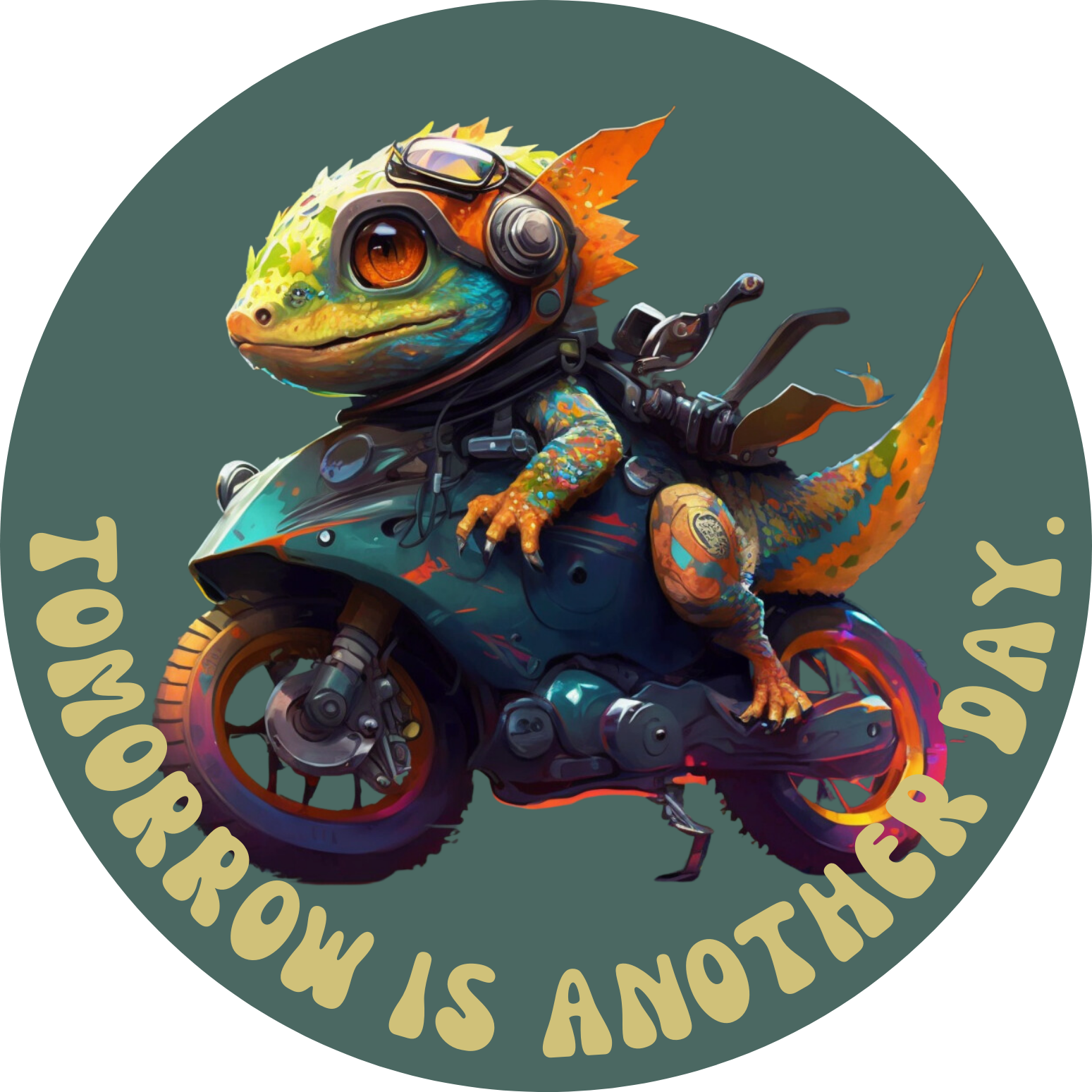 カメレオンがワイルドなバイク乗りになって、あなたの胸元にぴったりな57mmサイズのAIデザイン缶バッジとして登場しました!