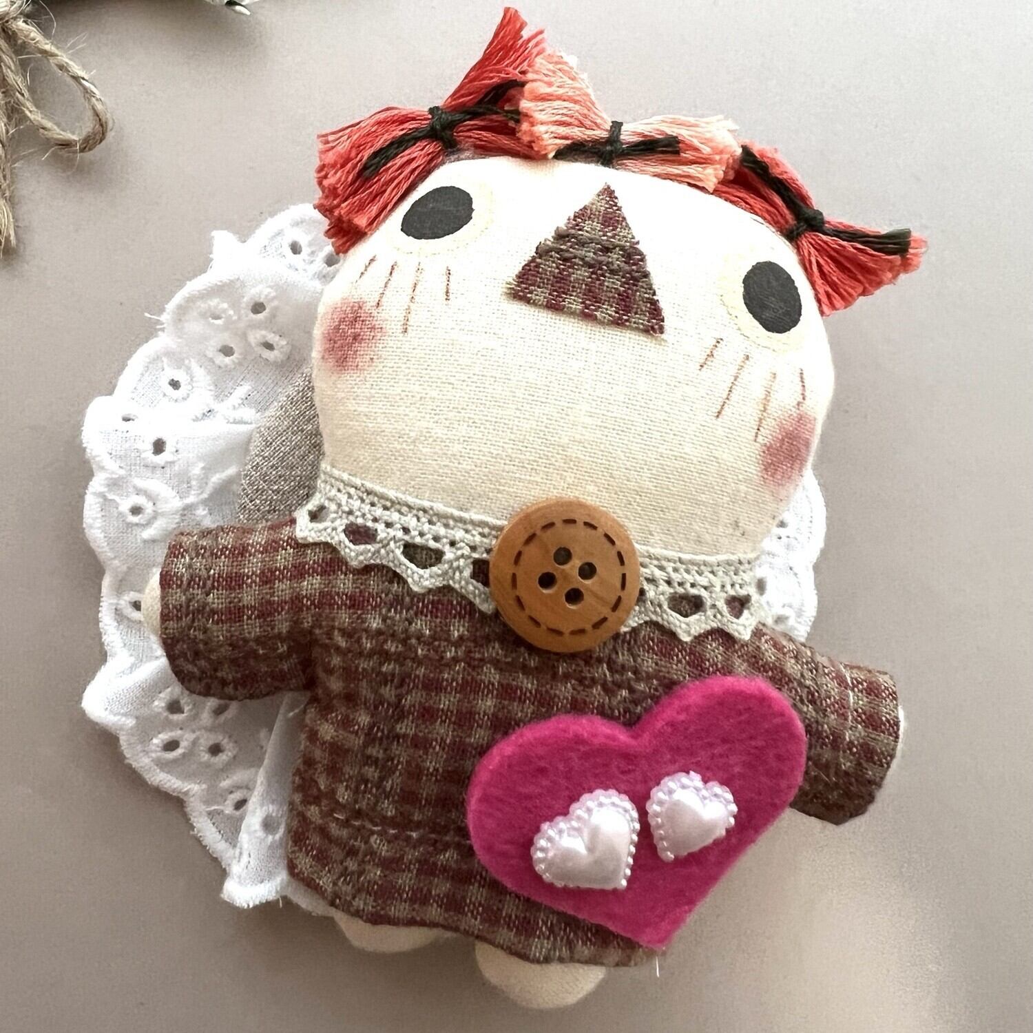 赤い髪のキュートな女の子の人形が、あなたの胸元にぴったりの57mmサイズの缶バッジになりました!