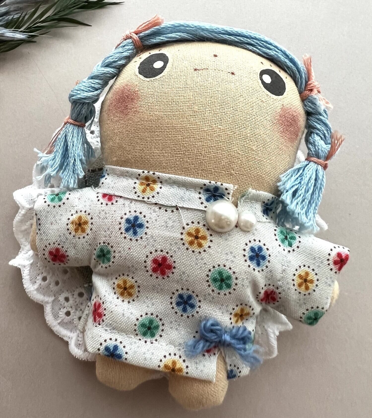 青髪で三つ編みのキュートな女の子の人形が、あなたの胸元にぴったりの57mmサイズの缶バッジになりました!