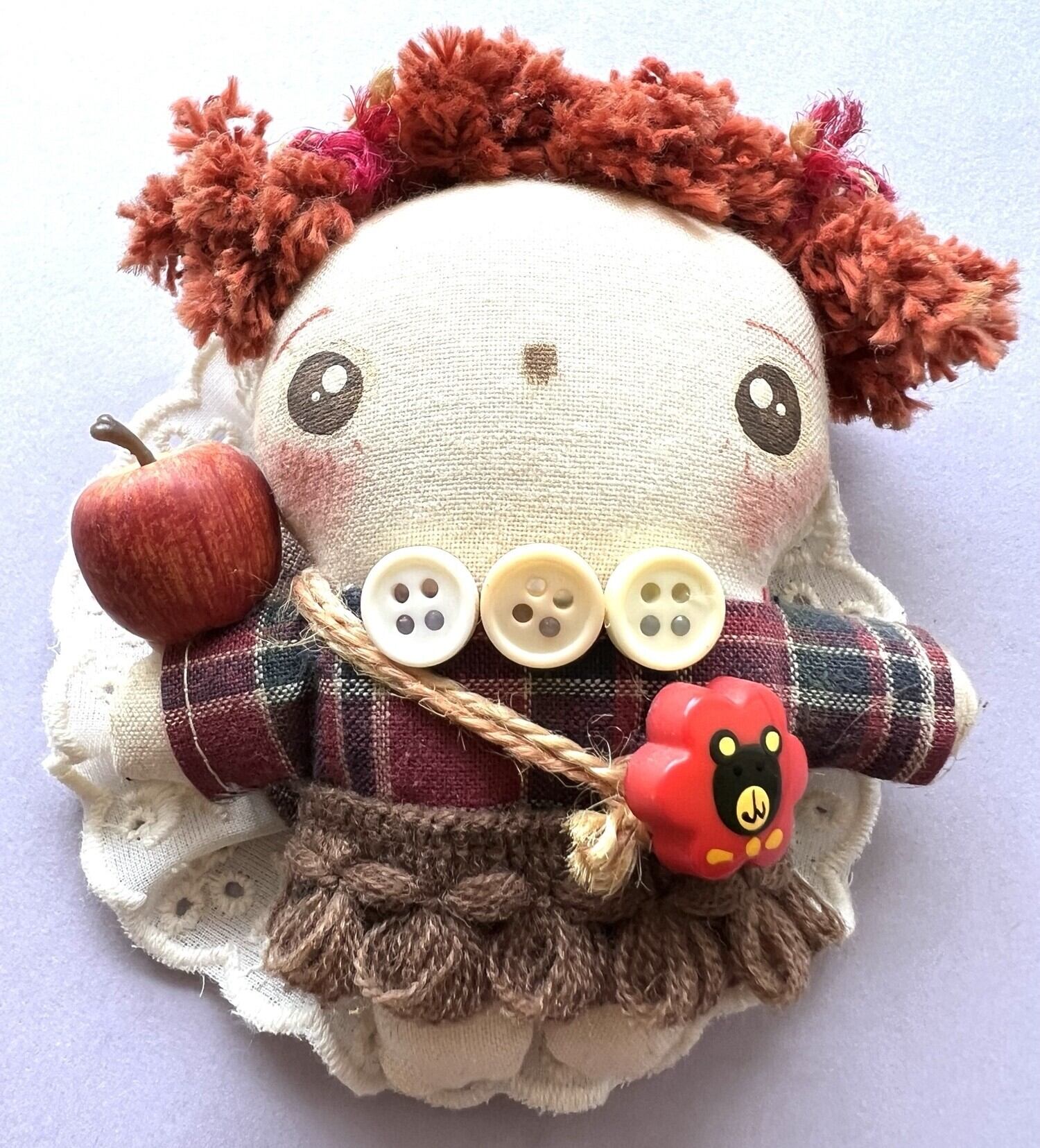 赤いりんごがトレードマークのキュートな女の子の人形が、あなたの胸元にぴったりの57mmサイズの缶バッジになりました!