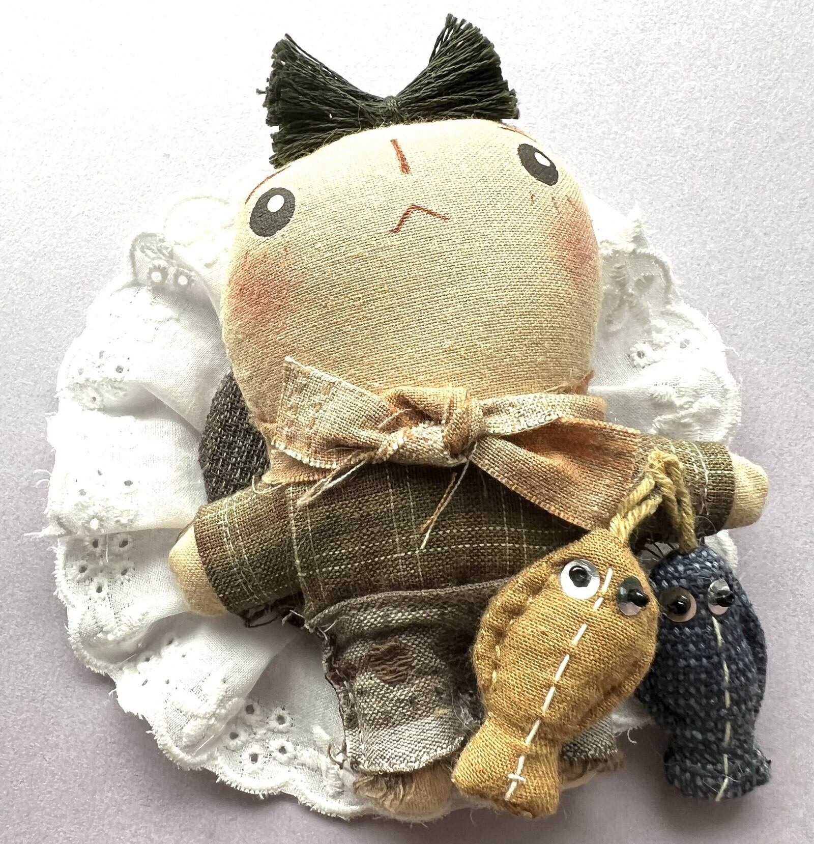 魚釣りが大好きな男の子の人形が、あなたの胸元にぴったりの57mmサイズの缶バッジになりました!