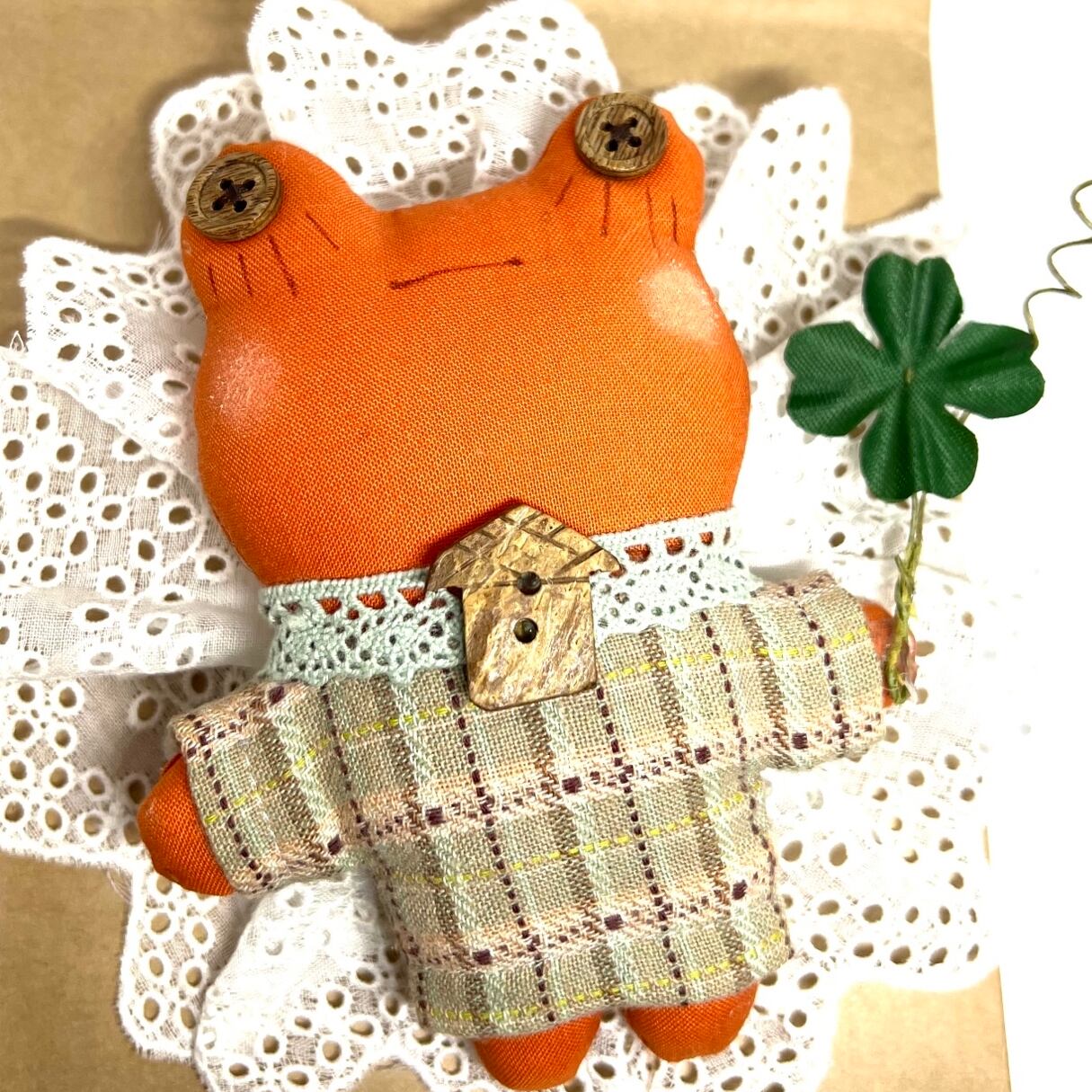 四つ葉のクローバーを手にしたオレンジ色のカエルさんのマスコットが、あなたの胸元にぴったりの57mmサイズの缶バッジになりました!