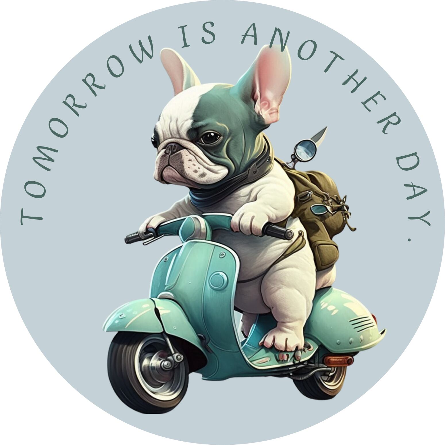 カントリースタイルのフレンチブルドッグがバイク乗りになって、あなたの胸元にぴったりな57mmサイズのAIデザイン缶バッジとして登場しました!