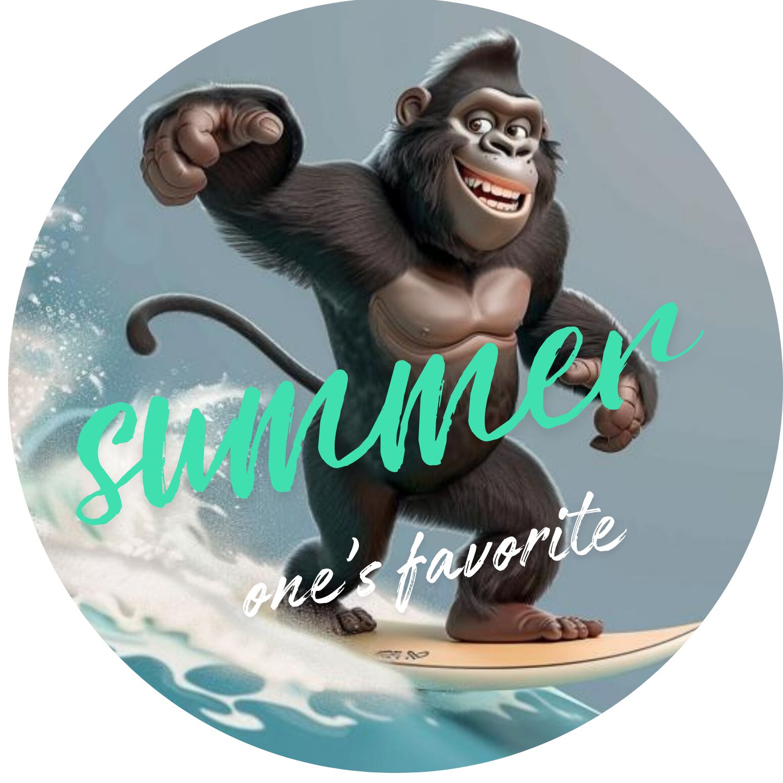 アロハスタイルのゴリラがサーファーになって、あなたの胸元にぴったりな57mmサイズのAIデザイン缶バッジとして登場しました!