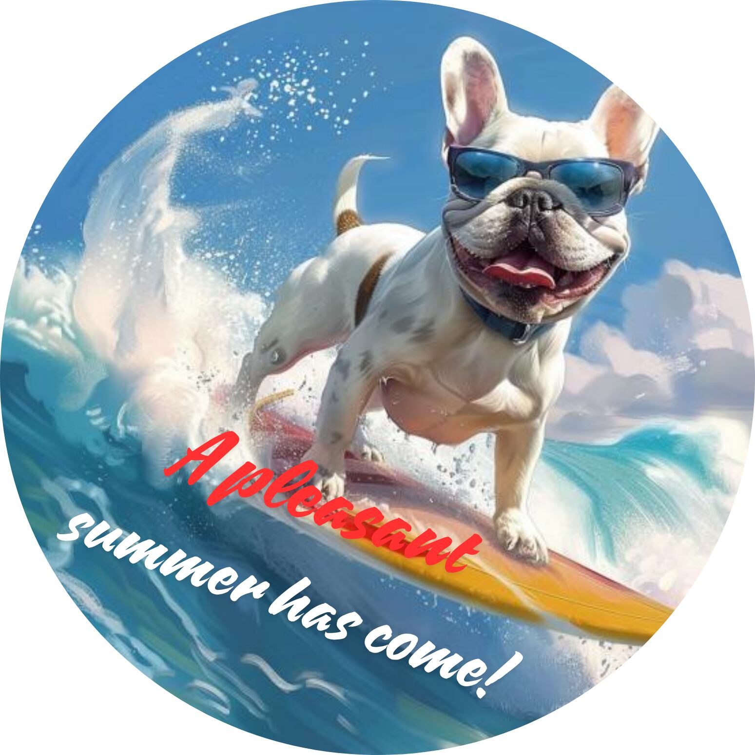 アロハスタイルのフレンチブルドッグがサーファーになって、あなたの胸元にぴったりな57mmサイズのAIデザイン缶バッジとして登場しました!