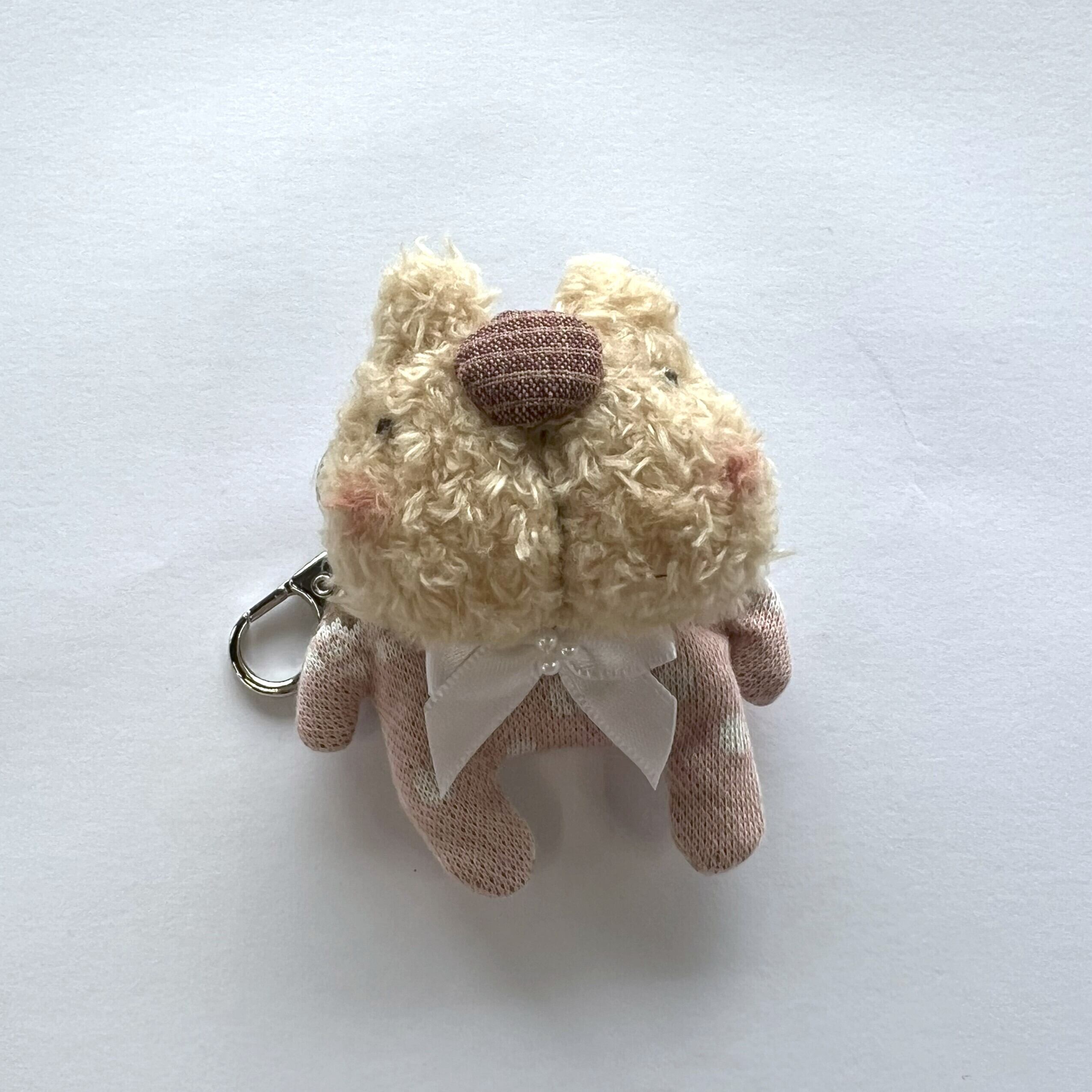 顔の部分はふんわり柔らかなボア生地を使用、体にはニットを使用しています。